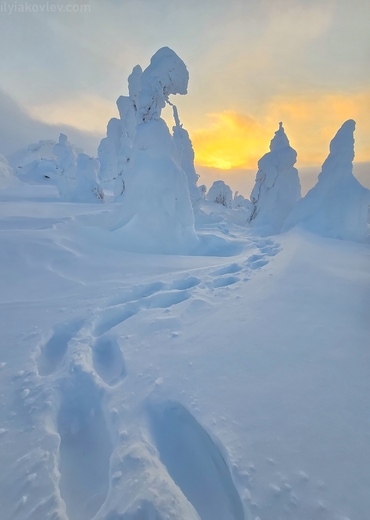 День 4. Утром отправляемся на снегоходах на камень Полюд, с которого открывается панорамный вид на бескрайнюю зимнюю тайгу. После съемки рассвета возвращаемся в гостиницу на обед, после чего вновь садимся на снегоходы и поднимаемся на камень Ветлан. На обзорной площадке с потрясающим видом на реку Вишера мы встретим закат.